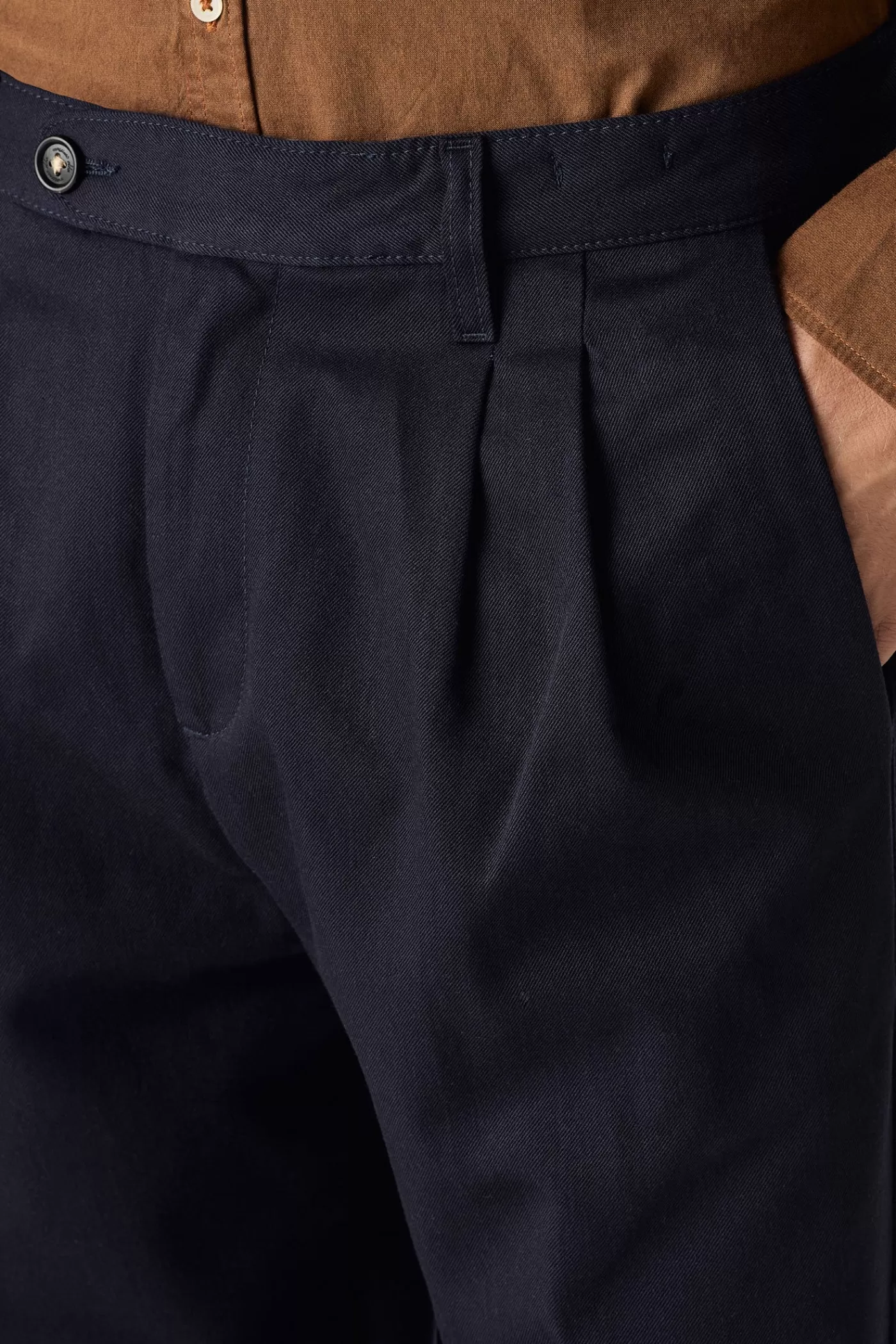 Comfort-fit double pleat trousers with a tab-button closure and zip, slant front pockets, rear fillet pockets, and a 19cm leg opening. Crafted from a wool-cotton blend.