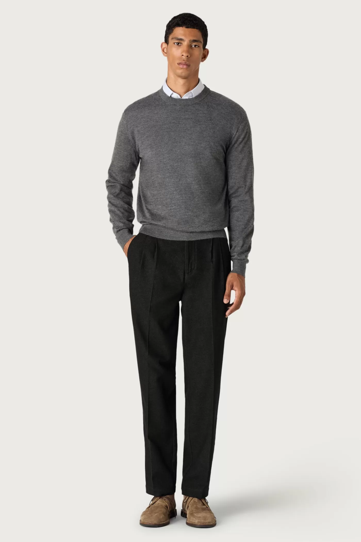 Pants with relaxed fit, waistband with tab, double pleats, French pockets, made of jaspé wool cotton.