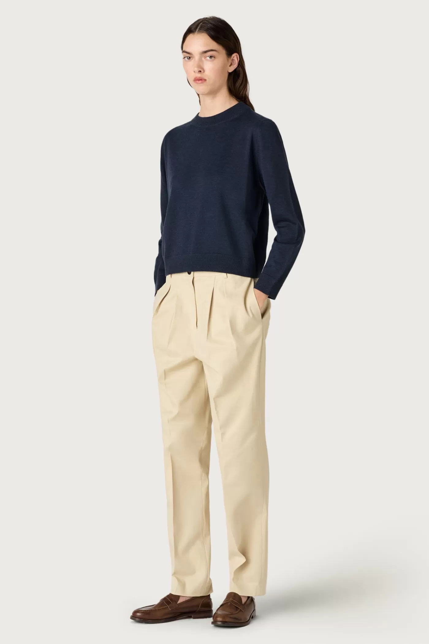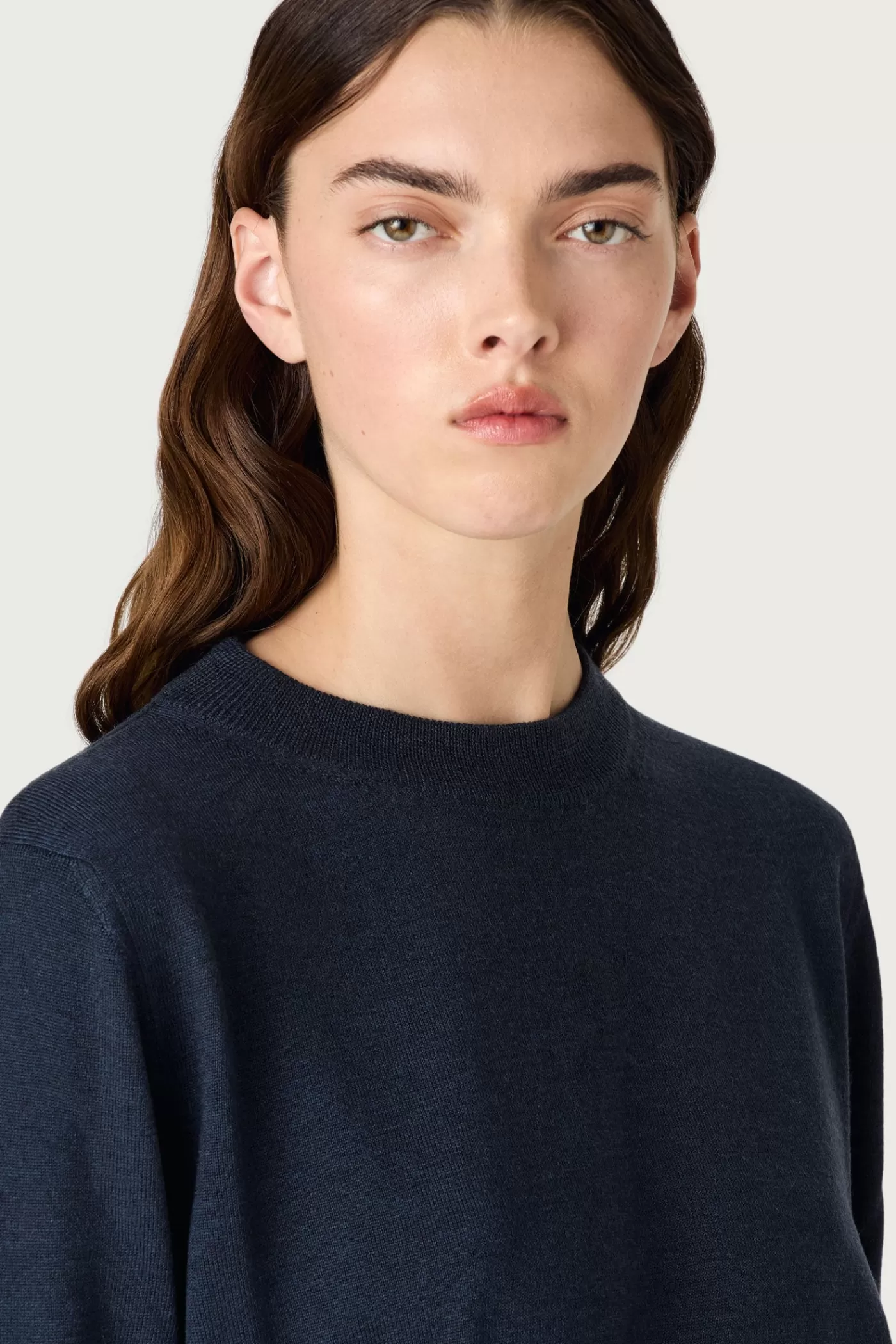 Crewneck ribbed knit sweater, ribbed edges, dropped shoulders, over fit, made of extra-fine merino wool.