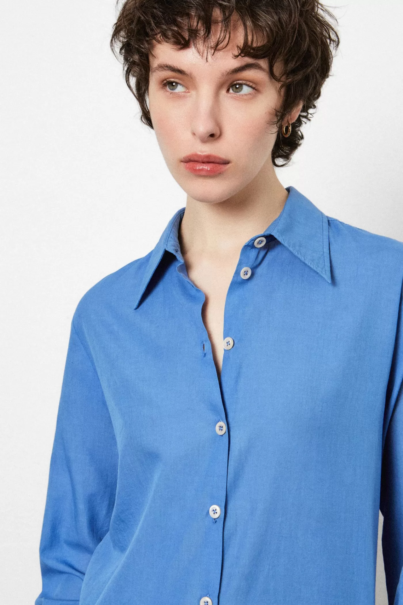 Shirt with pointed collar, classic fit, pointed yoke, without front placket, made of printed cashmere cotton voile.
