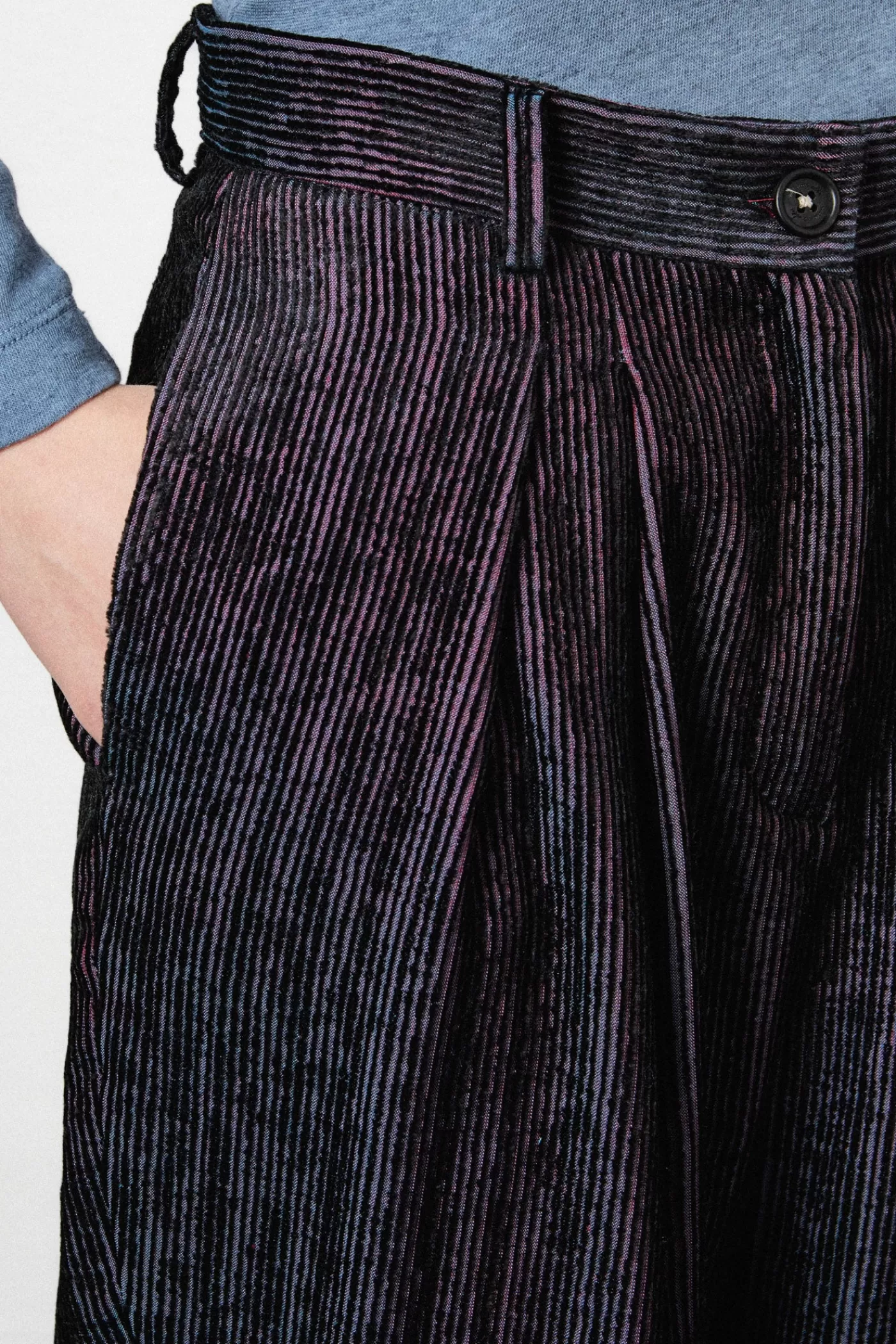 High-waist pants with comfort fit, double pleats, zip and horn button closure, made of velvet.