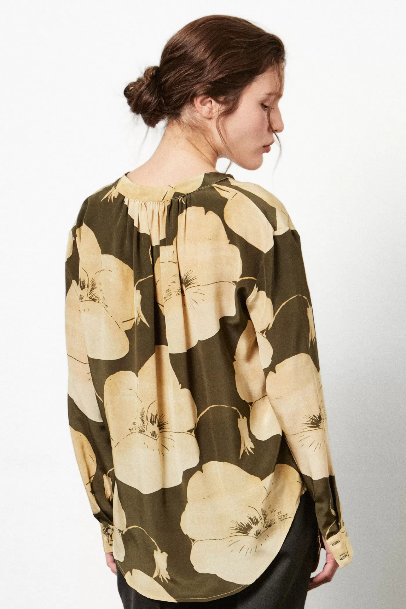 Blouse with Korean collar, deep neckline, high cuffs, made of printed crepe de chine.